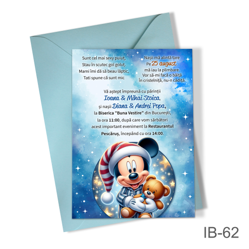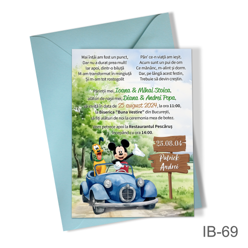 3.90 lei TVA inclusInvitatii botez baieti cu plic colorat – Mickey Mouse – IB-69