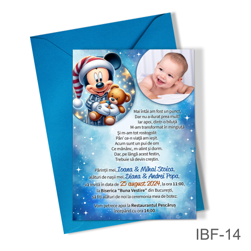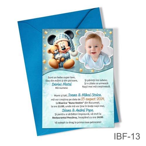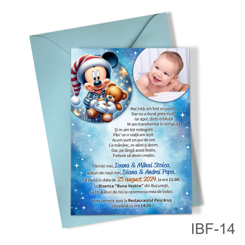 Prețul inițial a fost: 8.00 lei.4.00 leiPrețul curent este: 4.00 lei. TVA inclusInvitatii botez Mickey Mouse – Pliate Foto – IBPF-10
