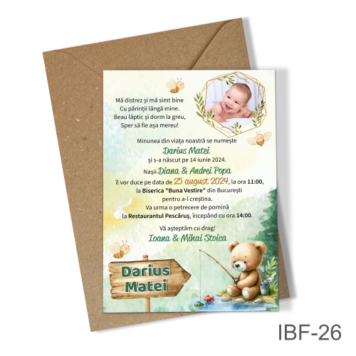 3.40 lei TVA inclusInvitatii botez baieti cu plic colorat – Ursulet – IB-108