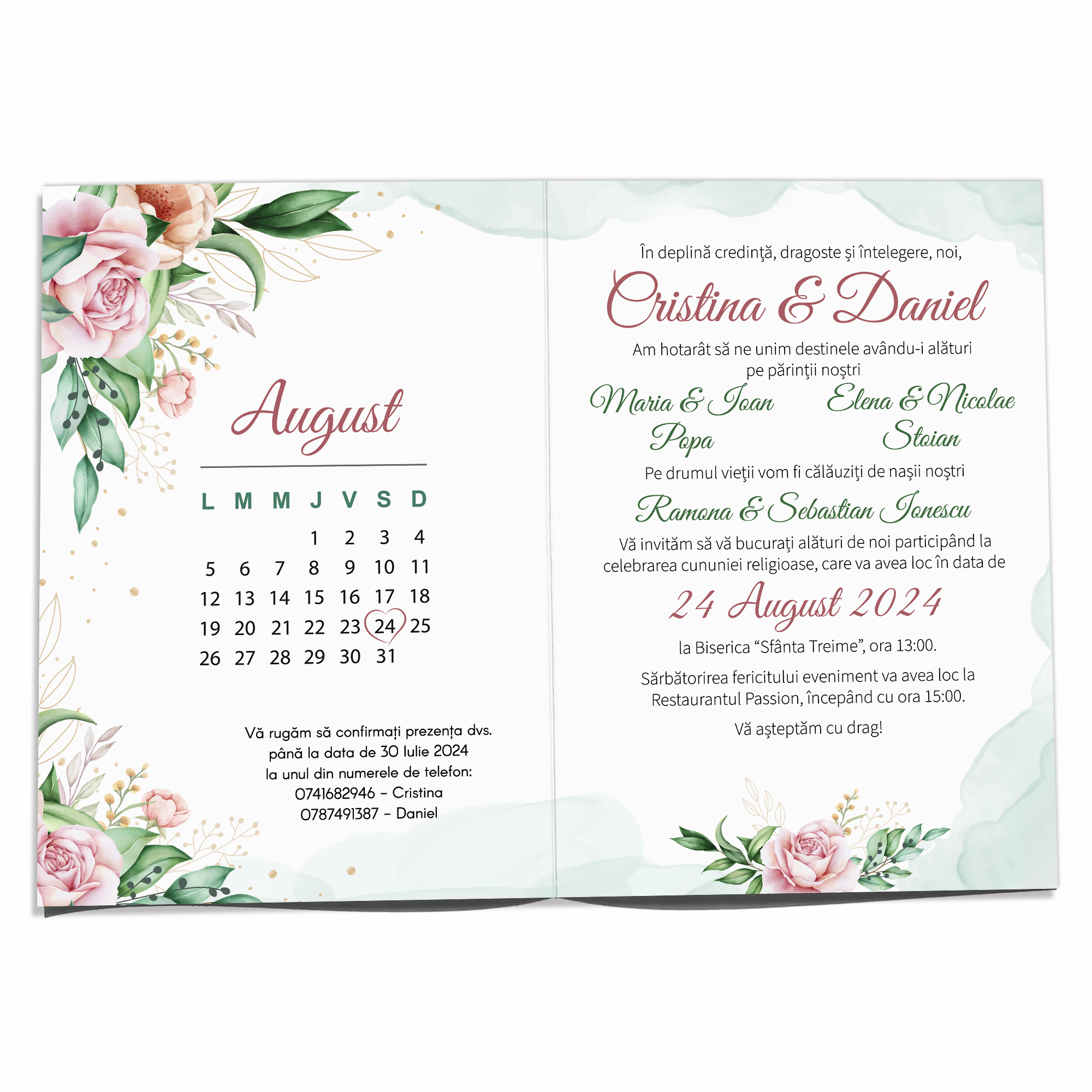 Pe lângă estetica rafinată, fiecare invitație este concepută pentru a fi cât mai informativă și ușor de navigat. De la detalii privind locația și ora ceremoniei, la instrucțiuni specifice, totul este prezentat clar și atrăgător, asigurându-vă că oaspeții vor avea toate informațiile necesare la îndemână.