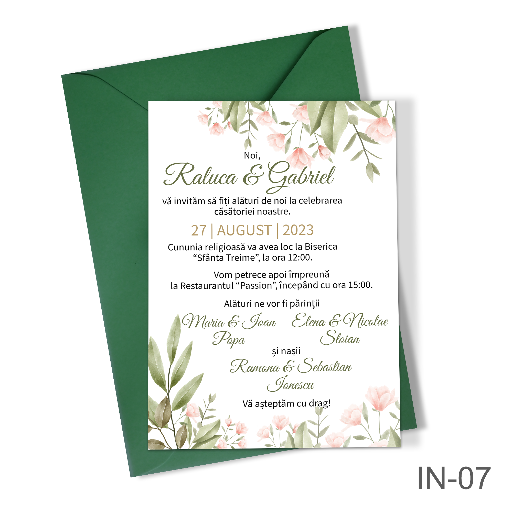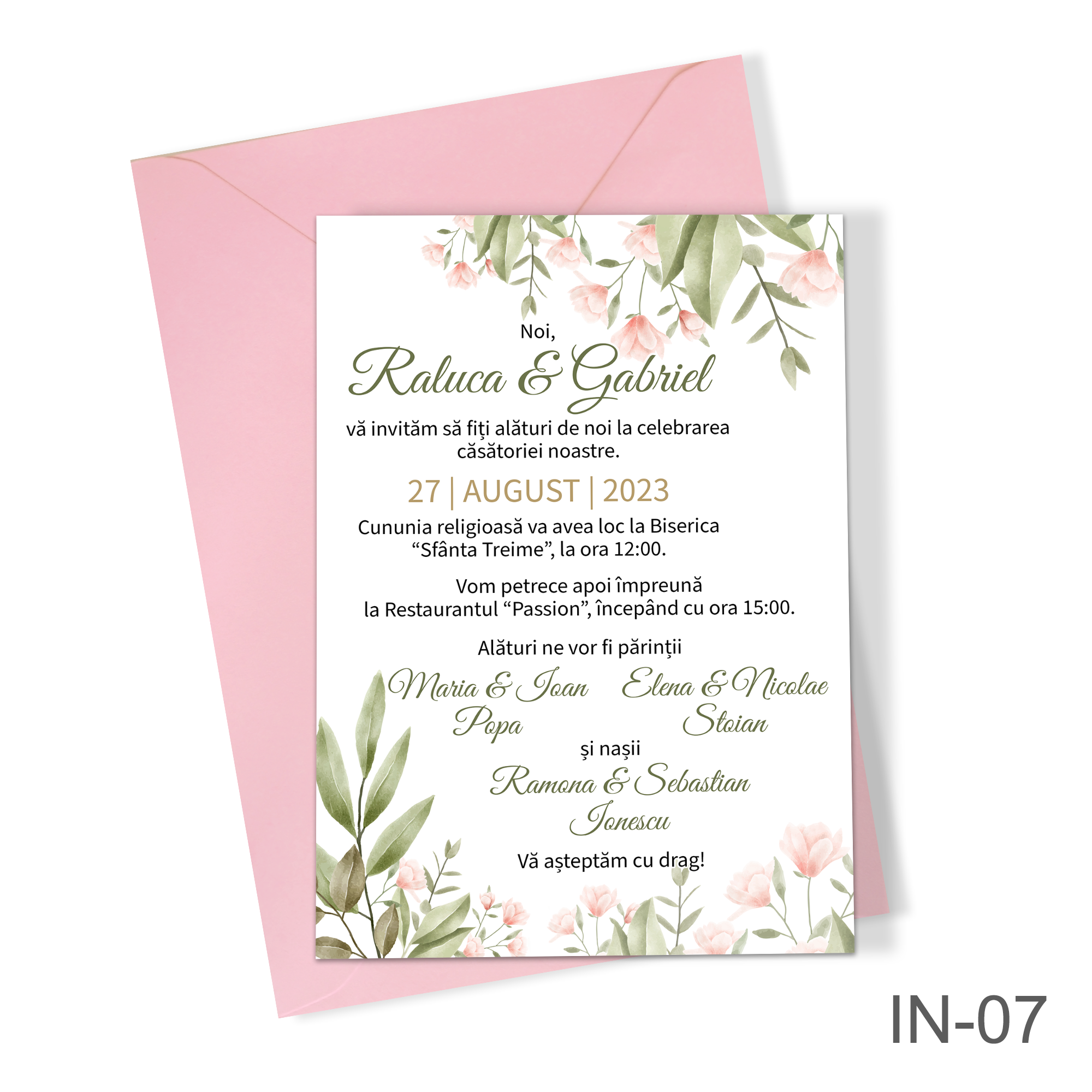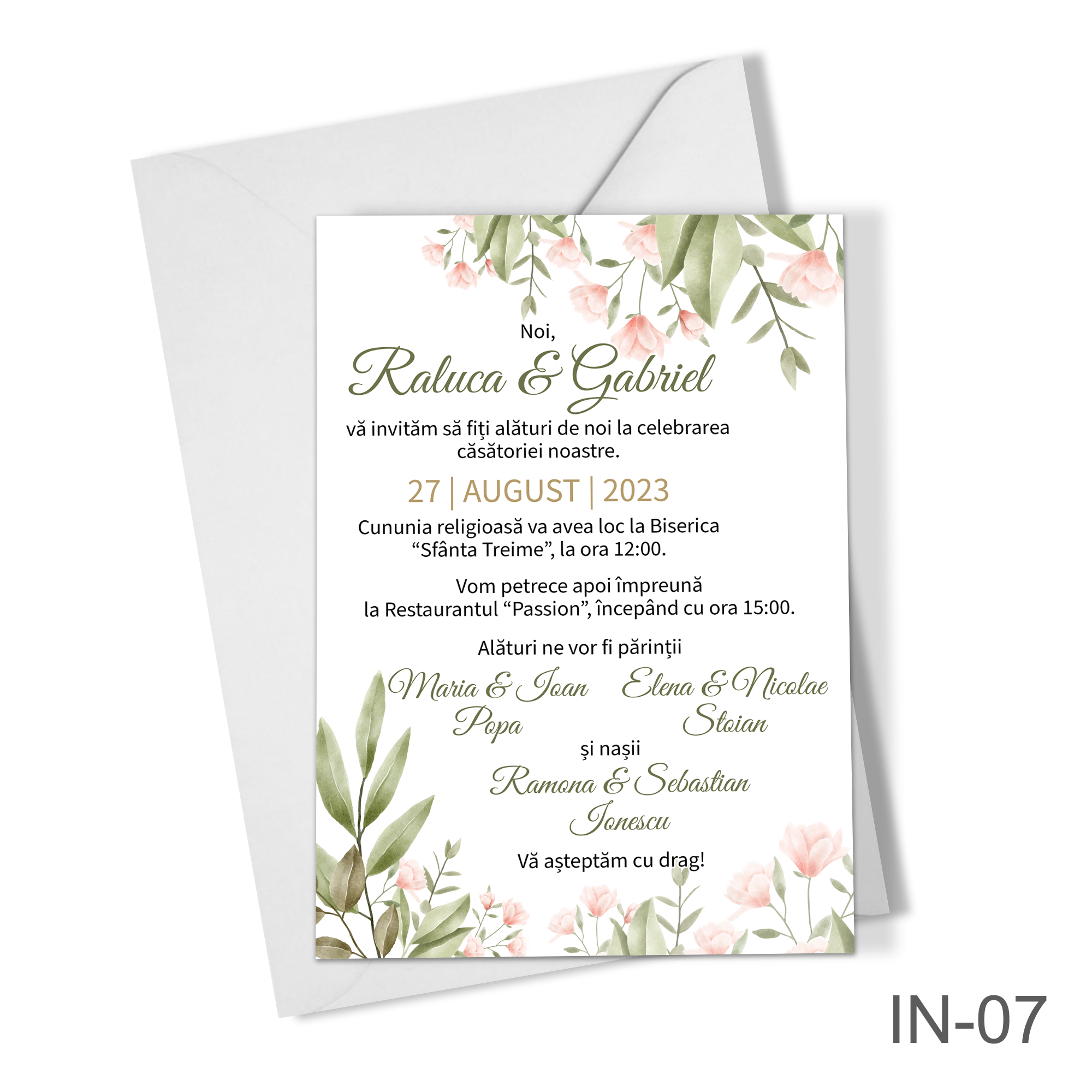 Invitatii pentru nunta cu tema Decoratiuni florale, gata tiparite si asamblate.
