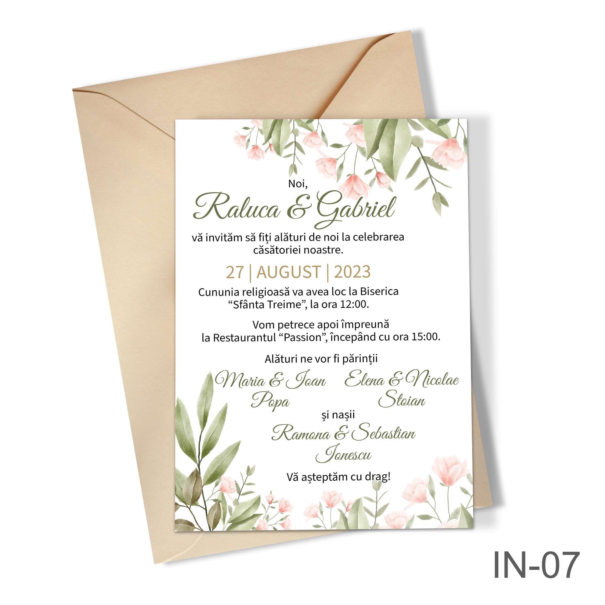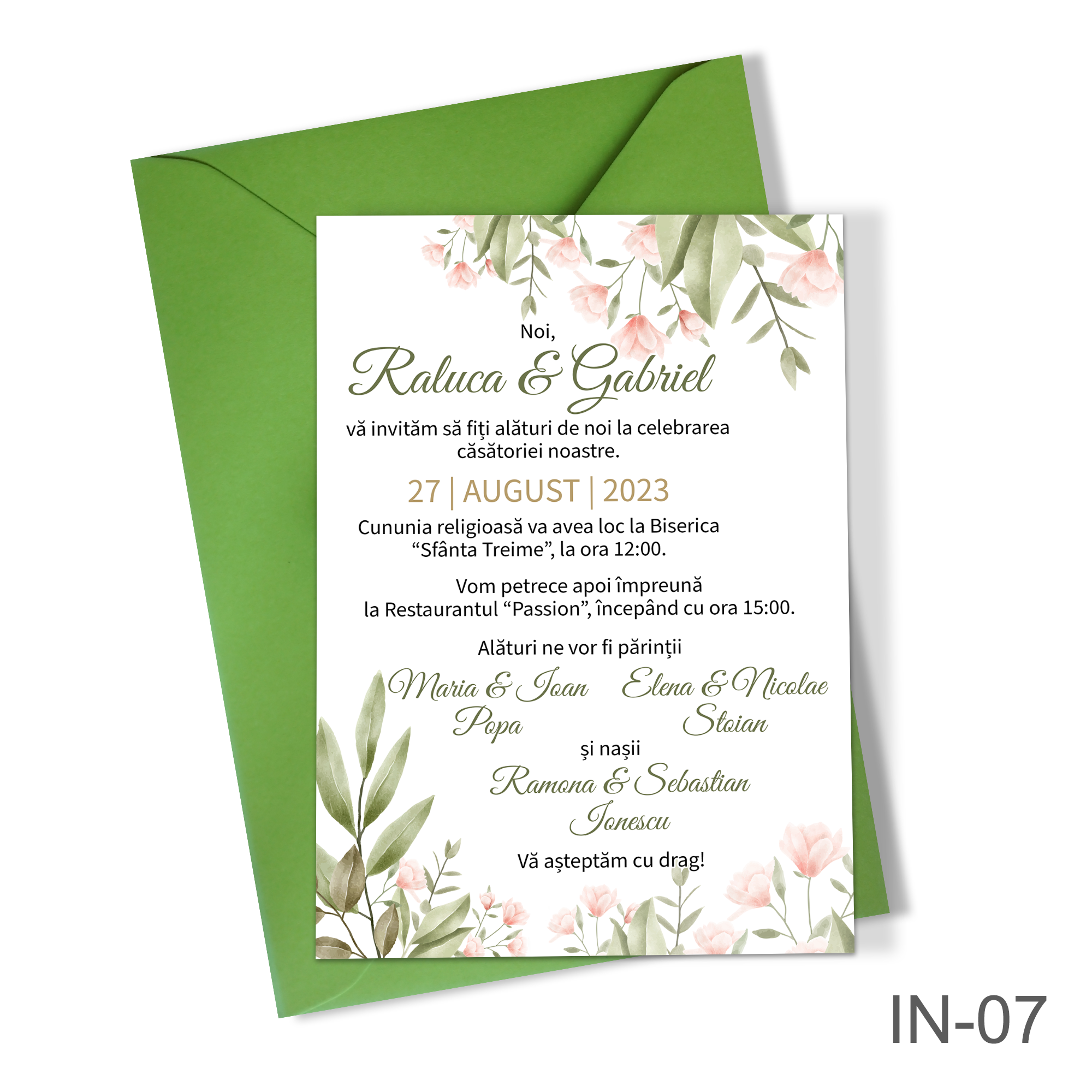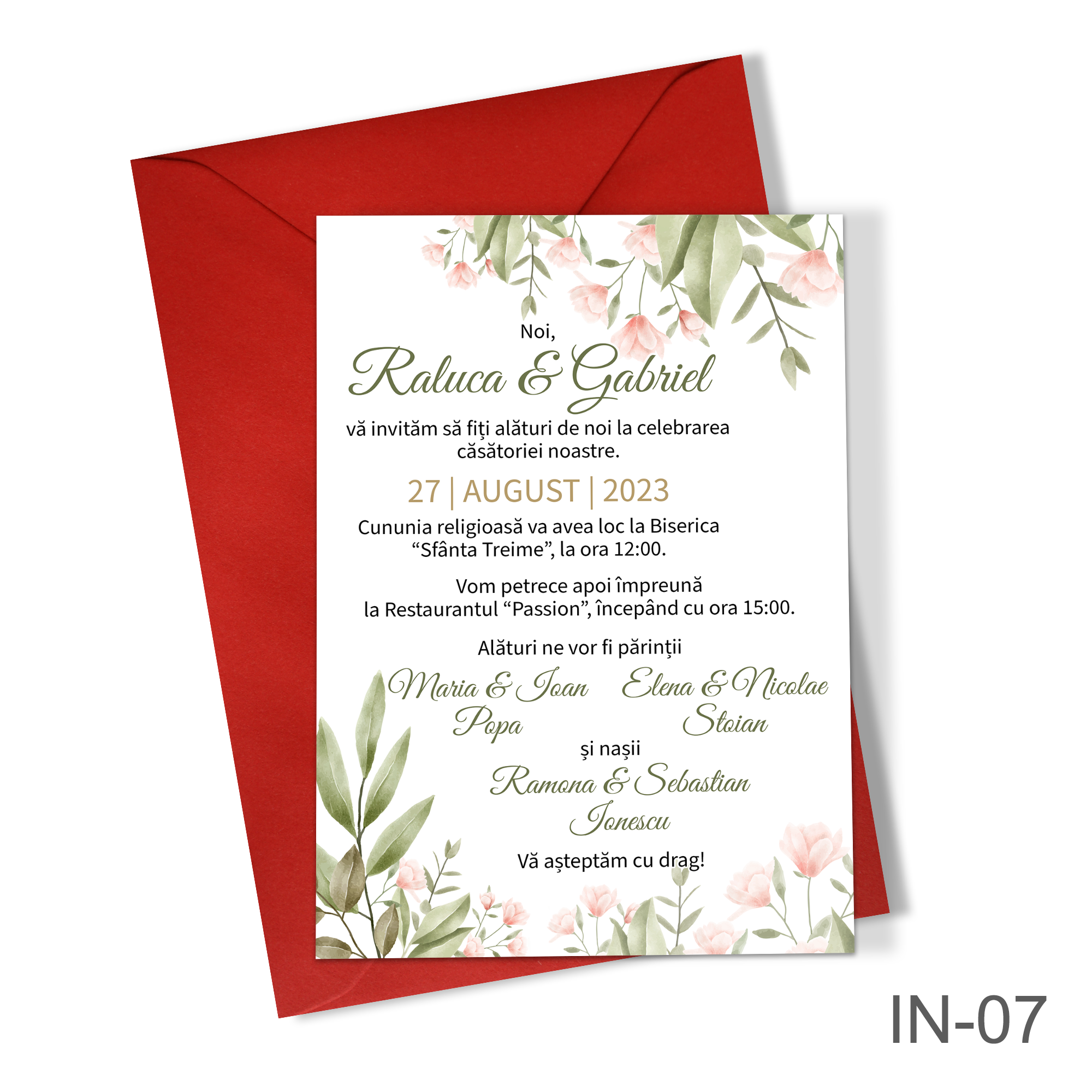 Invitatii pentru nunta cu tema Decoratiuni florale, gata tiparite si asamblate.