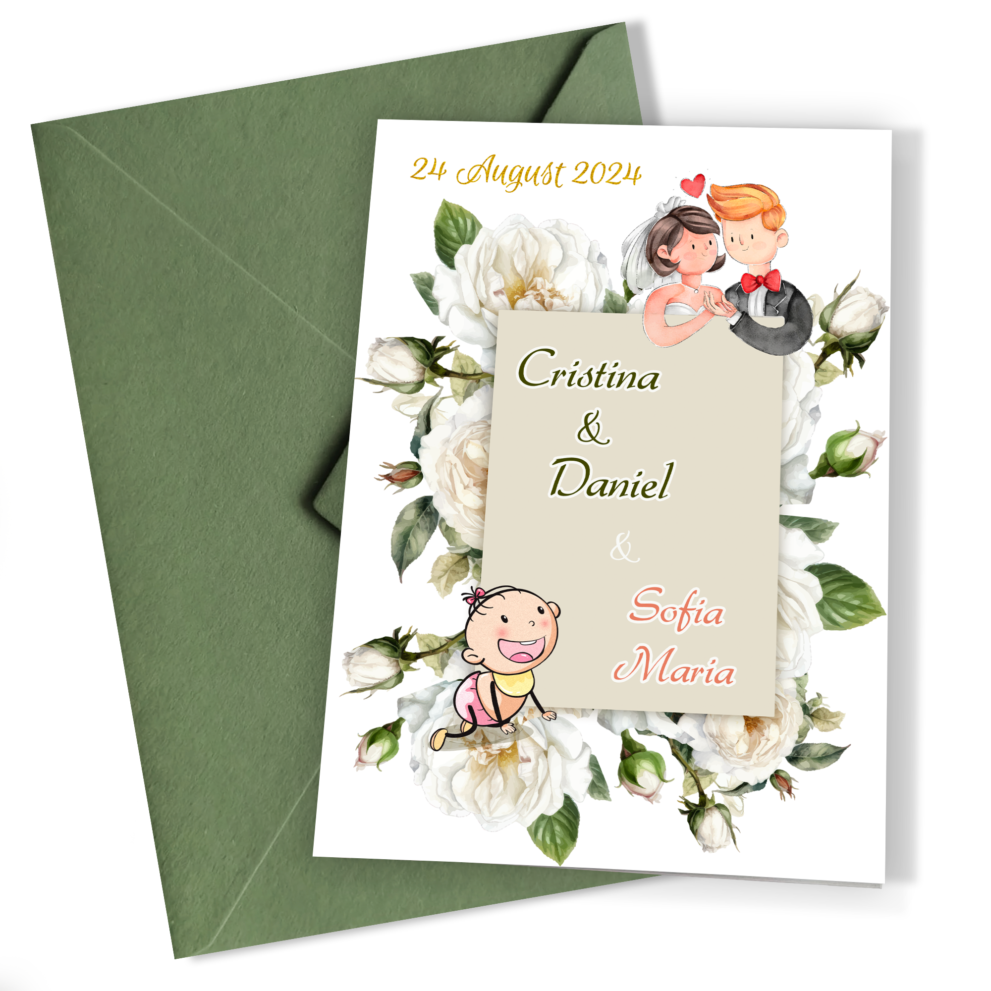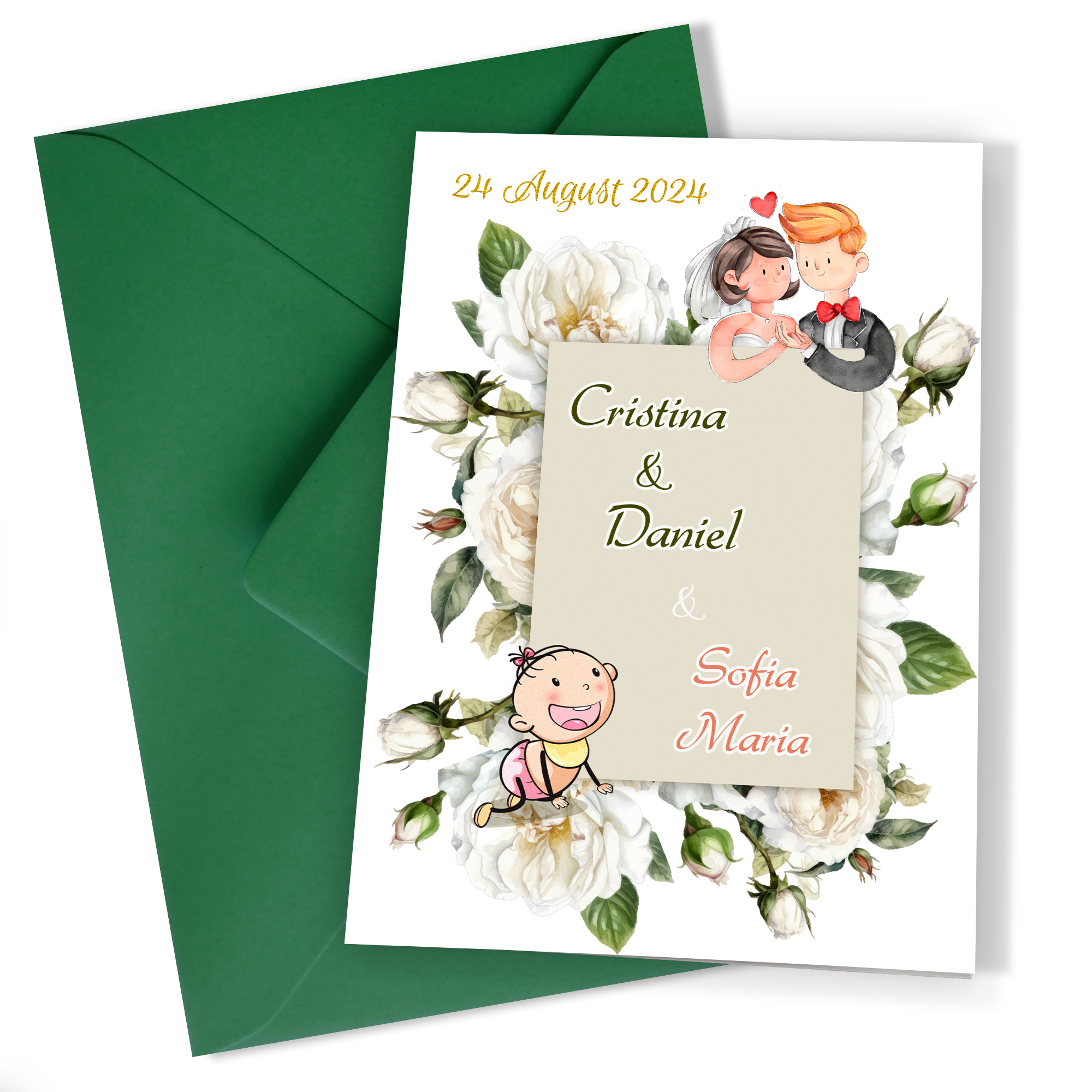 Fiecare invitație este o operă de artă, cu detalii florale minuțioase care înconjoară cu dragoste figurile familiei. Acest design, atent elaborat, vorbește despre unirea și creșterea familiei, marcând începutul unei noi călătorii împreună. Pe cartonul mat, culorile și liniile designului se combină armonios, creând o imagine de ansamblu emoționantă și invitând la celebrare.