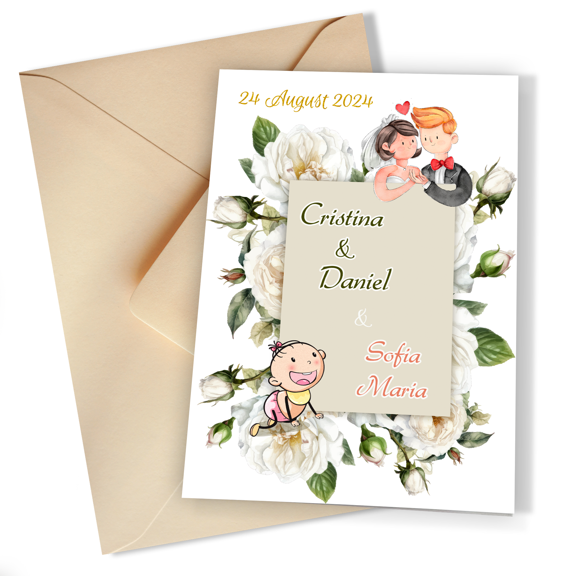 Invitațiile de nuntă și botez 2 în 1 reprezintă alegerea ideală pentru cei care doresc să celebreze două dintre cele mai importante evenimente din viață într-un mod unic și memorabil. Aceste invitații pliate, cu dimensiunea A5 când sunt închise și A6 odată deschise, sunt realizate pe un carton mat de înaltă calitate, care adaugă o notă de eleganță și rafinament. Designul, care îmbină delicat siluetele mirelui, miresei și ale bebelușului cu decorațiuni florale, este atât de vis, cât și profund personal. Plicul, oferit ca opțiune, permite personalizarea și mai mare, astfel încât fiecare cuplu să poată adăuga propria sa amprentă.