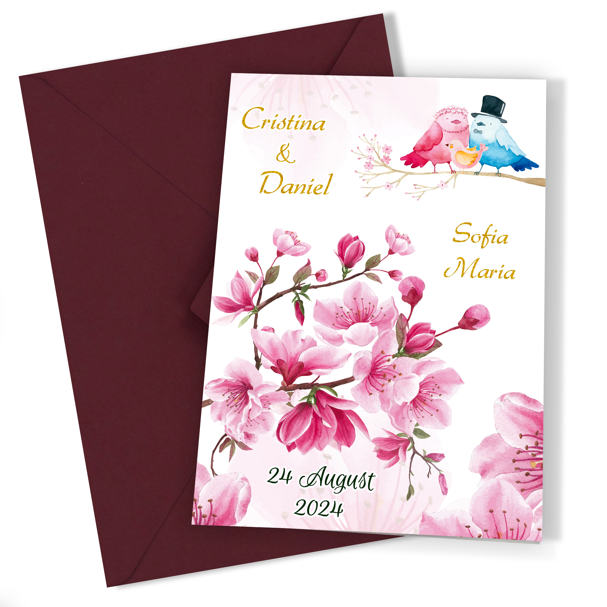 Fiecare invitație este o operă de artă, cu detalii florale minuțioase care înconjoară cu dragoste figurile familiei. Acest design, atent elaborat, vorbește despre unirea și creșterea familiei, marcând începutul unei noi călătorii împreună. Pe cartonul mat, culorile și liniile designului se combină armonios, creând o imagine de ansamblu emoționantă și invitând la celebrare.