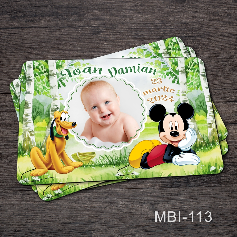 Descoperiți acum mărturii de botez pentru băieți, sub formă de magneți de frigider cu tematica Mickey Mouse si Pluto, perfecte pentru a păstra amintirea acestui eveniment special. Acești magneți, de dimensiuni 9×6 cm și cu o grosime de 0,7 mm, sunt flexibili și au colțurile rotunjite, asigurându-vă că sunt atât practici, cât și siguri. Fiecare magnet este creat pentru a adăuga un strop de bucurie și originalitate la celebrarea botezului.